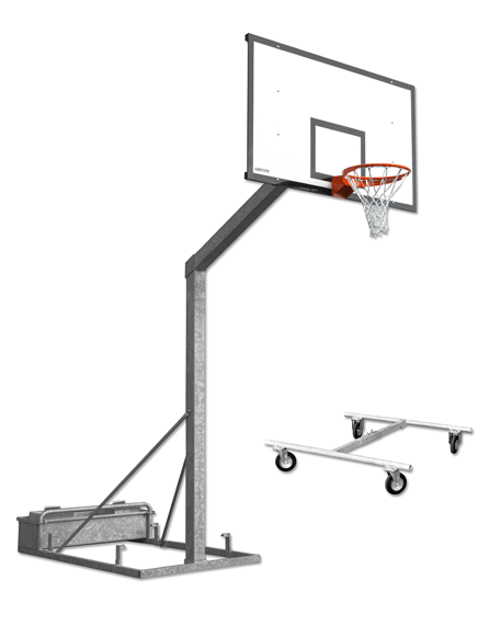 Impianto pallacanestro olimpionico trasportabile. Struttura in tubolare di acciaio verniciato diametro mm 40 con controventature e rinforzi di pari sezione. Sbalzo totale della struttura cm 225. Contenitori porta zavorra di lamiera di acciaio verniciato agganciabili sul retro della struttura. Completo di tabelloni di nobilitato bilaminato con dimensioni cm 180×105 e spessore mm 18 montati su telaio in acciaio verniciato, canestri fissi di acciaio verniciato e retina di cotone. Compreso un dispositivo meccanico aleva, in acciaio verniciato, per il sollevamento e trasporto dell’intera struttura a mezzo di ruote gommate con diametro mm 150 (2 ruote fisse e 2 ruote girevoli).