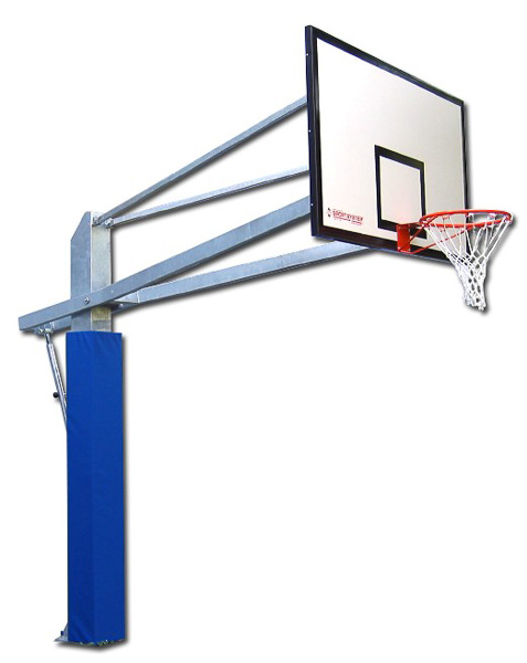 Impianto pallacanestro olimpionico a traliccio da fissare a terra. Struttura in tubolare di acciaio zincato a caldo diametro mm 40 con controventature e rinforzi di pari sezione. Sbalzo totale della struttura cm 225. Completo di tabelloni di resina melamminica con dimensioni cm 180×105 e spessore mm 10 montati su telaio in acciaio zincato, canestri fissi di acciaio verniciato e retine di nylon.