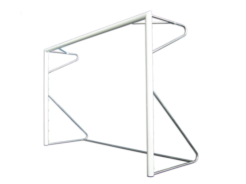 Coppia porte gioco calcetto trasportabili realizzate in profilato di alluminio verniciato a sezione rotonda, diametro mm 80, rinforzato con nervature interne antiflessione. Giunzioni angolari in fusione di alluminio ad innesto. Complete di reggirete posteriori di acciaio verniciato reclinabili e pieghevoli con cerniera, ganci di plastica per attacco reti e tasselli per fissaggio al terreno. Dimensioni interne cm 300×200.