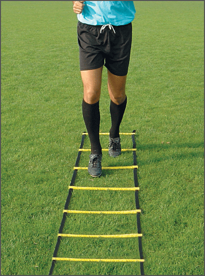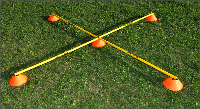 Kit coordinatore di frequenza per attività ginniche, allenamento gioco calcio ed altri sport. Elementi composti di nastri laterali in materiale sintetico uniti tra loro da asticelle trasversali in materiale plastico. Picchetti di acciaio per fissaggio al terreno. Sacca per trasporto.