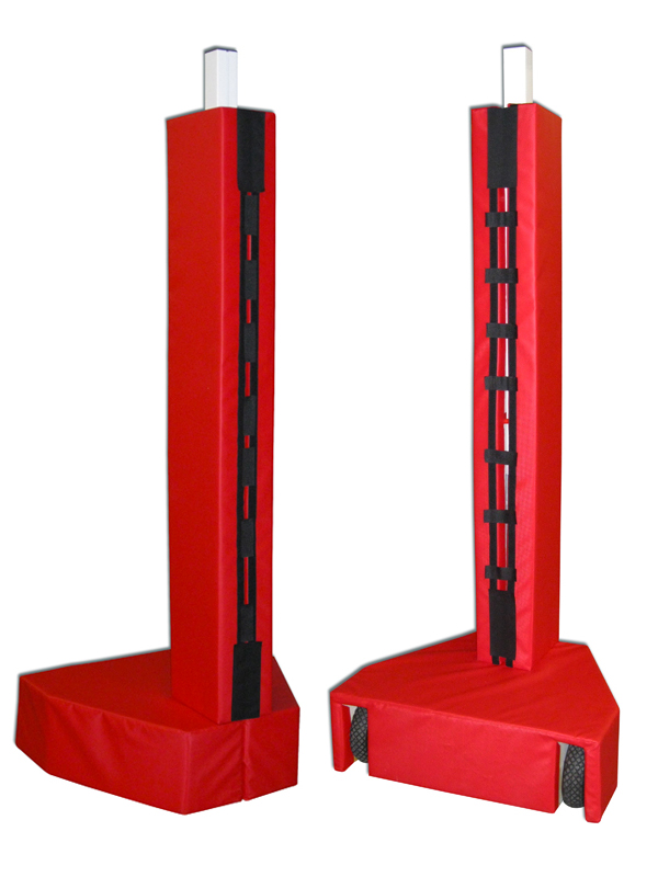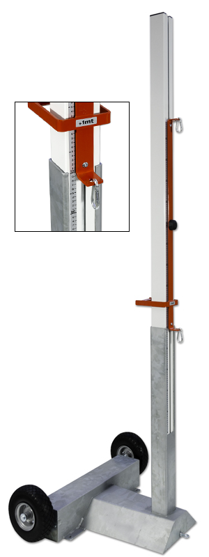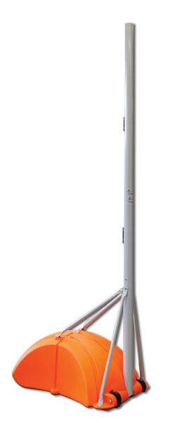 Impianto multifunzione professionale per utilizzo gioco volley, minivolley, tennis e salto in alto. Composto di 2 strutture mobili su ruote gommate con base zavorrata in acciaio zincato, palo di alluminio verniciato con astina centimetrata e cursore scorrevole con ganci di fissaggio rete e supporti per asticella salto in alto e maniglia sul lato posteriore. Bloccaggio del cursore a qualsiasi altezza a mezzo pomello. Rete esclusa