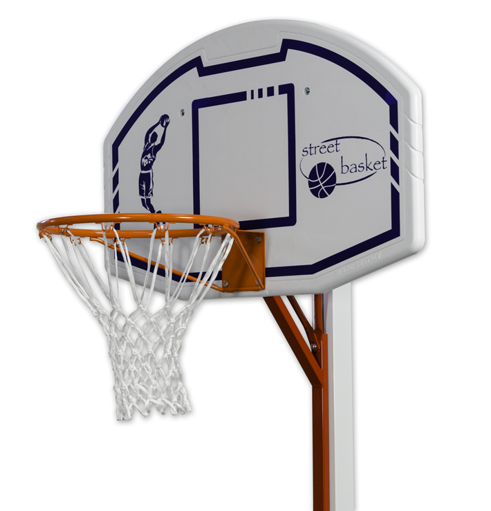 Coppia tabelloni di plastica con canestro su supporto in acciaio verniciato per utilizzo dell’impianto multifunzione S05206 per gioco basket e minibasket.