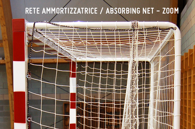 Coppia porte gioco pallamano trasportabili realizzate in profilato di alluminio verniciato (bianco-nero, bianco-rosso, bianco-blu) a sezione quadrata mm 80×80, rinforzato con nervature interne antiflessione. Giunzioni angolari in fusione di alluminio ad innesto. Complete di reggirete posteriori di acciaio verniciato, ganci di plastica per attacco reti e tasselli per fissaggio al terreno. Dimensioni interne cm 300×200.