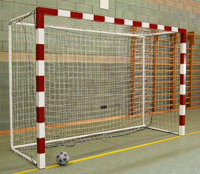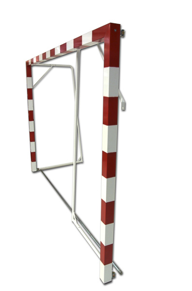 Coppia porte gioco pallamano trasportabili realizzate in profilato di alluminio verniciato (bianco-nero, bianco-rosso, bianco-blu) a sezione quadrata mm 80×80, rinforzato con nervature interne antiflessione. Giunzioni angolari in fusione di alluminio ad innesto. Complete di reggirete posteriori di acciaio verniciato reclinabili e pieghevoli con cerniera, ganci di plastica per attacco reti e tasselli per fissaggio al terreno. Dimensioni interne cm 300×200.