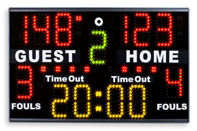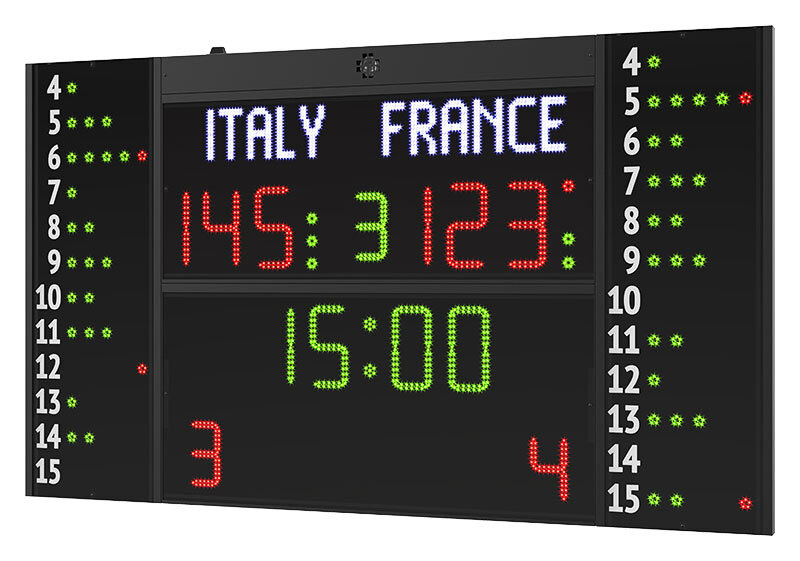 Tabellone elettronico multisport FC54H25N12A1 con nomi squadre programmabili e falli dei singoli giocatori, dimensioni cm 240×145, trasmissione radio, altezza cifre cm 25. FIBA – Level 2