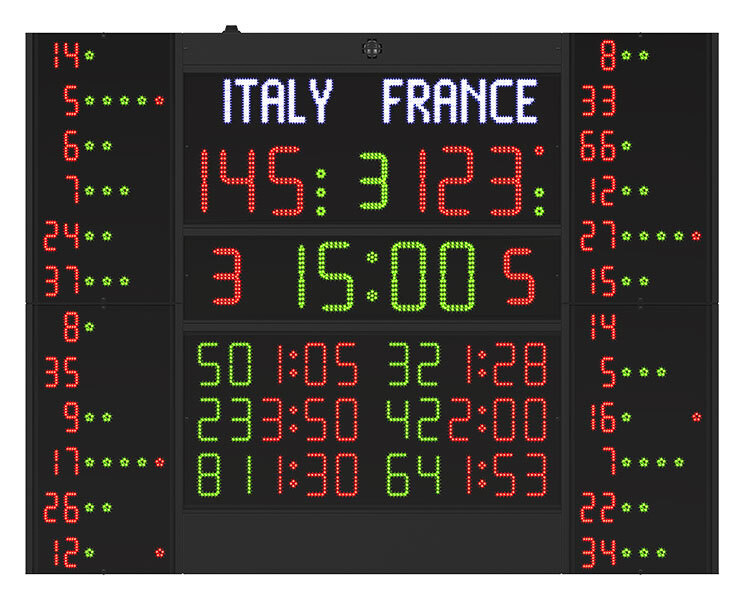 Tabellone elettronico multisport FC62H25N12B2 con nomi squadre programmabili, numero e falli dei singoli giocatori, penalità, dimensioni cm 260×200, trasmissione radio, altezza cifre cm 25