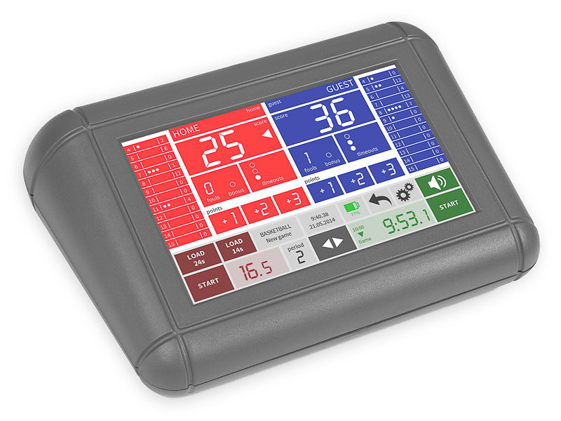 Tabellone elettronico multisport portatile da tavolo PS-M, imensioni cm 55×35, incluso pannello di controllo integrato sul retro. Visualizzazione punteggio delle due squadre, cronometro, time out, periodo di gioco, possesso palla o turno di battuta. Segnalazione acustica. Completo di alimentatore. A richiesta disponibili: valigetta, batteria ricaricabile, carica batterie, pulsantiera separata con cavo di trasmissione.