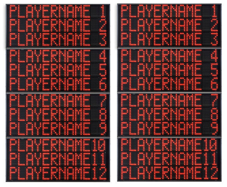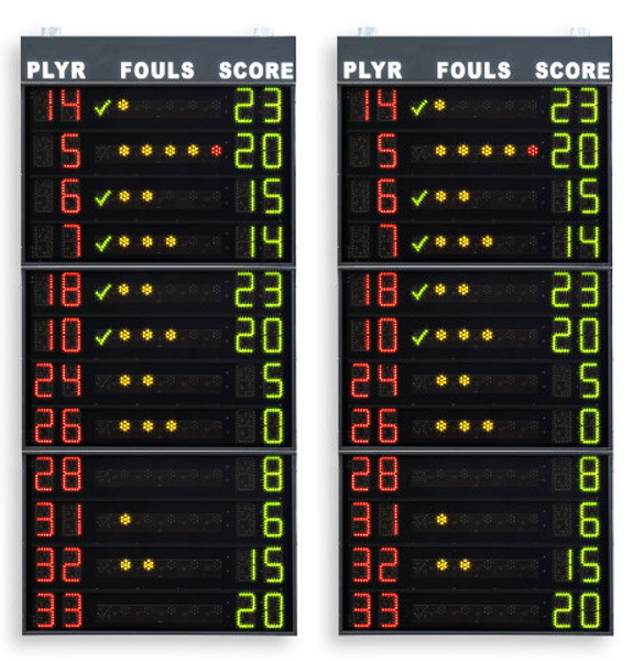 Coppia guanciale laterali FS-414D con visualizzazione nr di maglia di 14 giocatori (programmabili), falli personali in cifre, dimensione di ciascun guanciale cm 80×300