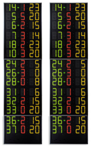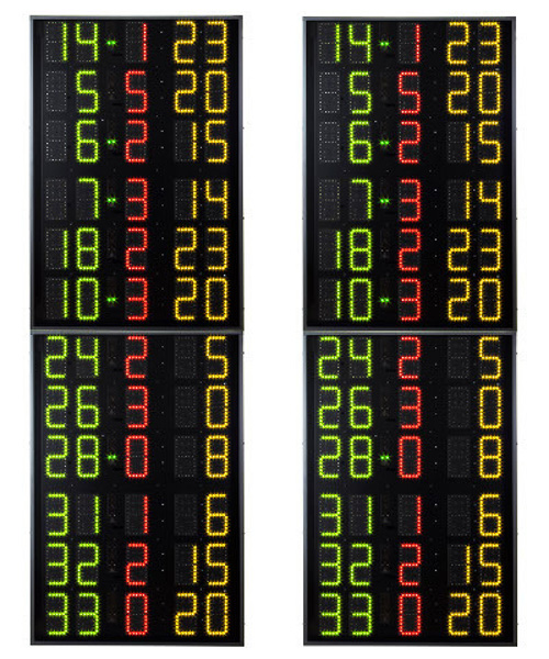 I modelli di tabelloni segnapunti elettronici offerti da Sport System variano per forma, dimensioni e informazioni riportate. Trattandosi di tabelloni multisport, anche con nomi programmabili delle squadre, possono essere adattati a qualsiasi attività sportiva.