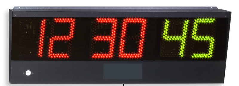 Cronometro da interno con visualizzazione ore, minuti e secondi, dimensioni cm 120×40, trasmissione via cavo, completo di console di comando, programmabile con conteggio crescente o decrescente.