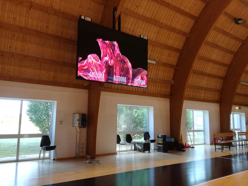 Display LED per ambiente sportivo indoor con funzione promozionale e comunicativa, dimensioni cm 300×200. Fornito con struttura di supporto e sistema di controllo