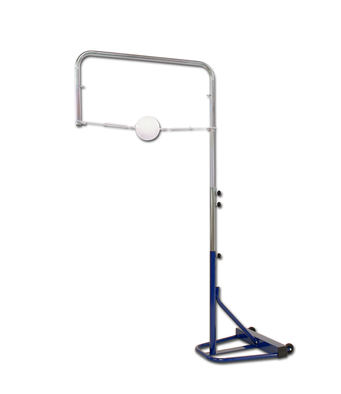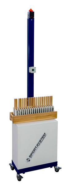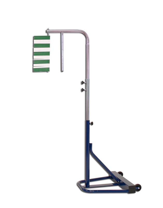 Misuratore di elevazione. Struttura in acciaio verniciato con basamento pesante e ruote di trasporto. Sistema di regolazione in altezza con bloccaggio a mezzo di pomelli. Tesserine colorate girevoli per indicazione dell’altezza di salto.