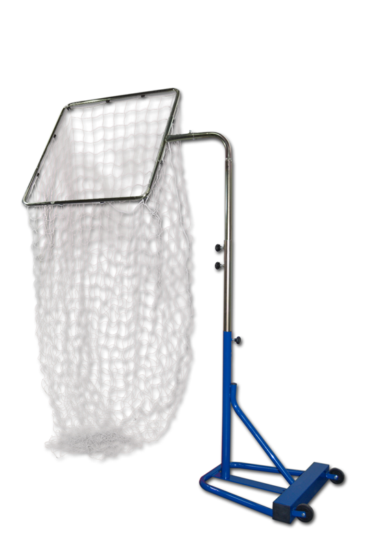 Volleyball Training. Attrezzo per allenamento ai tiri di precisione. Struttura in acciaio verniciato con basamento pesante e ruote di trasporto. Sistema di regolazione in altezza con bloccaggio a mezzo di pomelli. Cesto orientabile con rete di raccolta palloni.