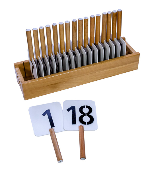 Serie palette per sostituzione giocatori di legno, numerate, complete di supporto in legno. Serie di 18 pezzi (1-18).