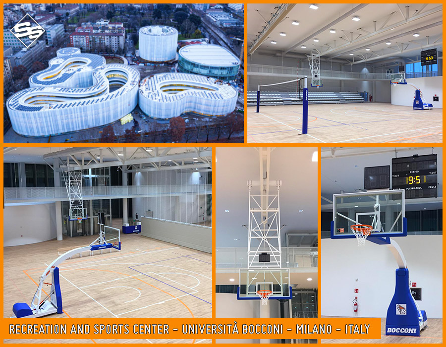 Una nuova referenza di prestigio per Sport System. Presso il futuristico Recreation and Sports Center dell’Università Bocconi di Milano è stata completata l’installazione di un pacchetto completo di attrezzature ed arredi comprendente una tenda divisoria combinata (codice S07604) da mt 30×8; un impianto basket Hydroplay Ace (codice S04100); un impianto basket a soffitto (codice S04070); attrezzi per volley, calcetto e set completo di tabelloni elettronici. Il tutto personalizzato nella scelta dei colori e mediante serigrafia di loghi come da precise disposizioni del cliente.
