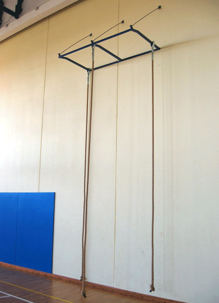 Escaleras de cuerda, postes, cuerdas de cáñamo y equipos de montañismo para ser fijados a la pared son aparatos esenciales en todo gimnasio que quiera darles a sus atletas la posibilidad de ejercer la coordinación, la fuerza y el equilibrio pedidos por las disciplinas de escalada.