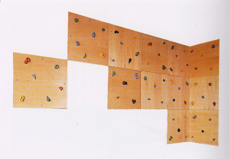 Área de práctica de escalada, consta de 12 diferentes paneles de madera de haya montadas en estructura de acero pintado para ser fijada a la pared. Cada panel tiene dimensión de 120×120 cm y está equipado con 5 ganchos de resina cada uno de ellos diferentes en forma, dimensiones y color. Los ganchos de resina se puede fijar en diferentes posiciones en los paneles de madera permitiendo cambiar en cualquier momento la dificultad del ejercicio.