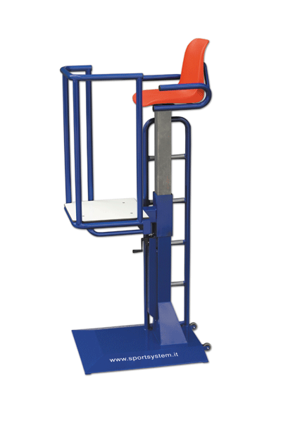 Palchetto professionale per arbitro pallavolo regolabile in altezza da cm 100 a cm 150. Robusta struttura in tubolare e scatolato di acciaio verniciato con montante centrale in acciaio zincato e sistema di regolazione in altezza a mezzo di arganello manuale. Piano di calpestio in stratificato, spessore mm 10. Parapetto perimetrale, scaletta di accesso laterale e ruote per il trasporto integrate alla base. Scocca di seduta in polipropilene colorato con schienale.