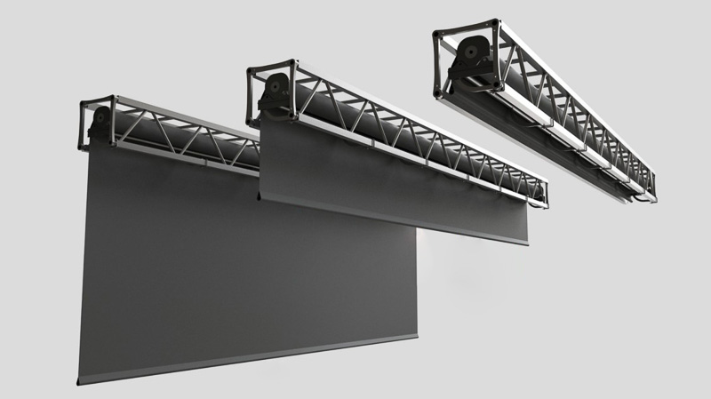 Tenda divisoria combinata roll-up per campi gioco realizzata in materiale sintetico ignifugo a singolo telo per cm 270 da terra e “mesh” per la restante altezza. Funzionamento elettrico. Chiusura compatta in soli 40 cm