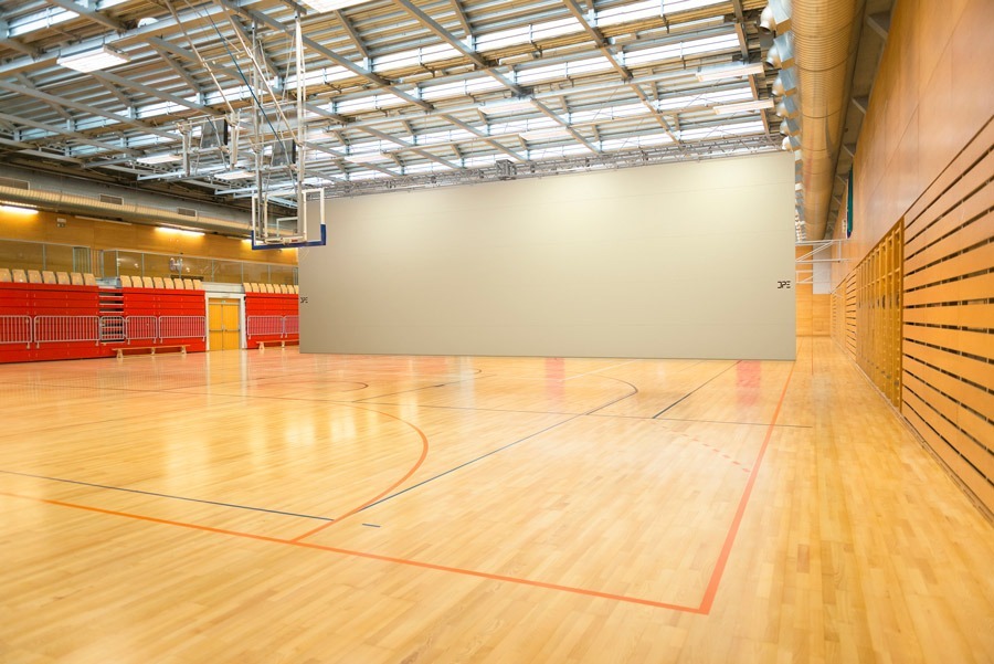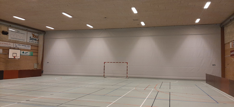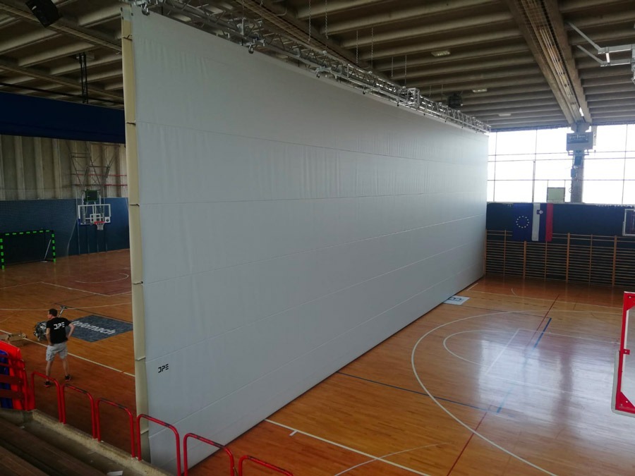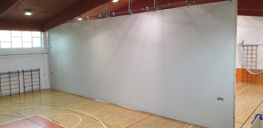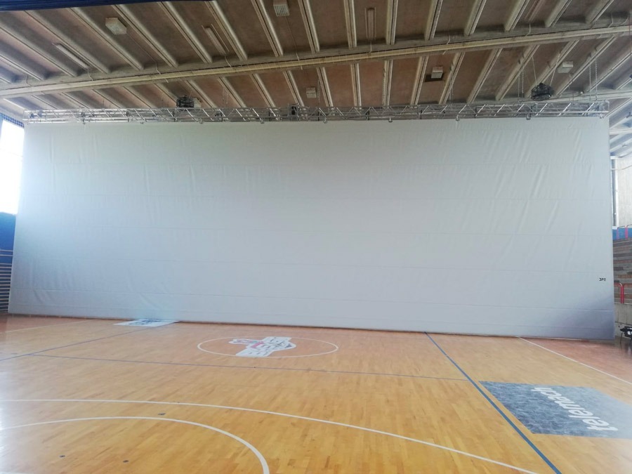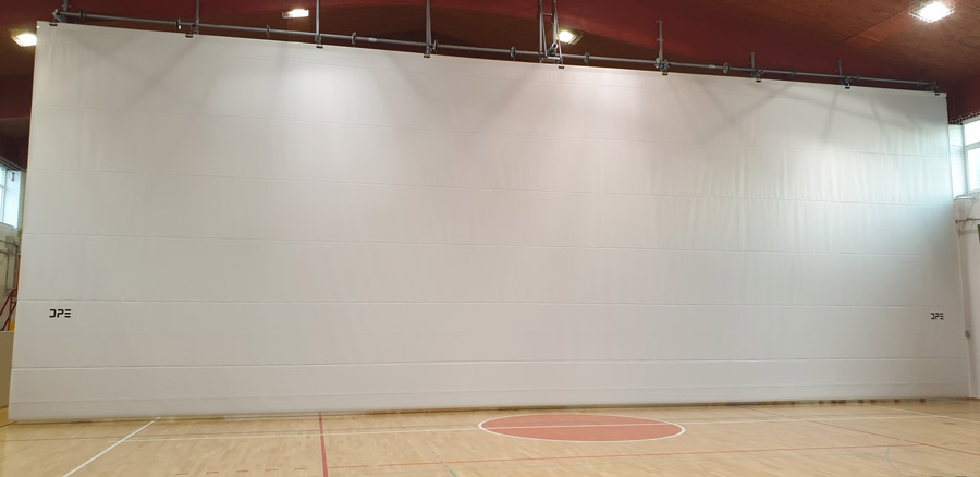 Tenda divisoria “acustica” per campi da gioco realizzata in materiale sintetico ignifugo a doppio telo, scorrimento verticale con funzionamento elettrico